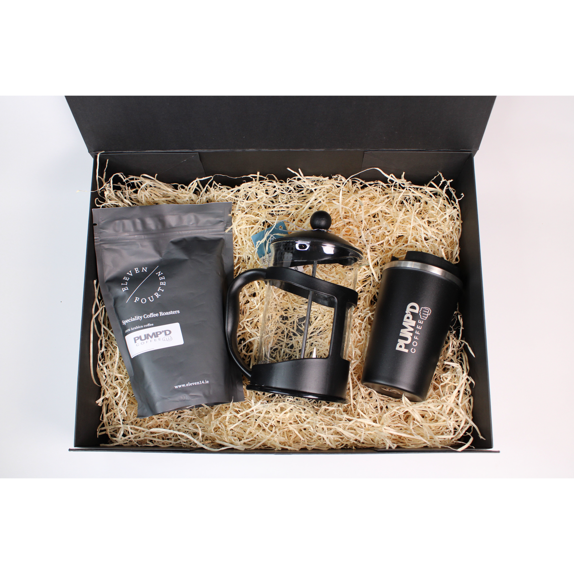 A perfect starter set for anyone brewing coffee at home. It includes a bag of freshly ground coffee, a classic French press for easy, rich brewing, and a sturdy stainless steel mug to enjoy every cup warm and on the go.